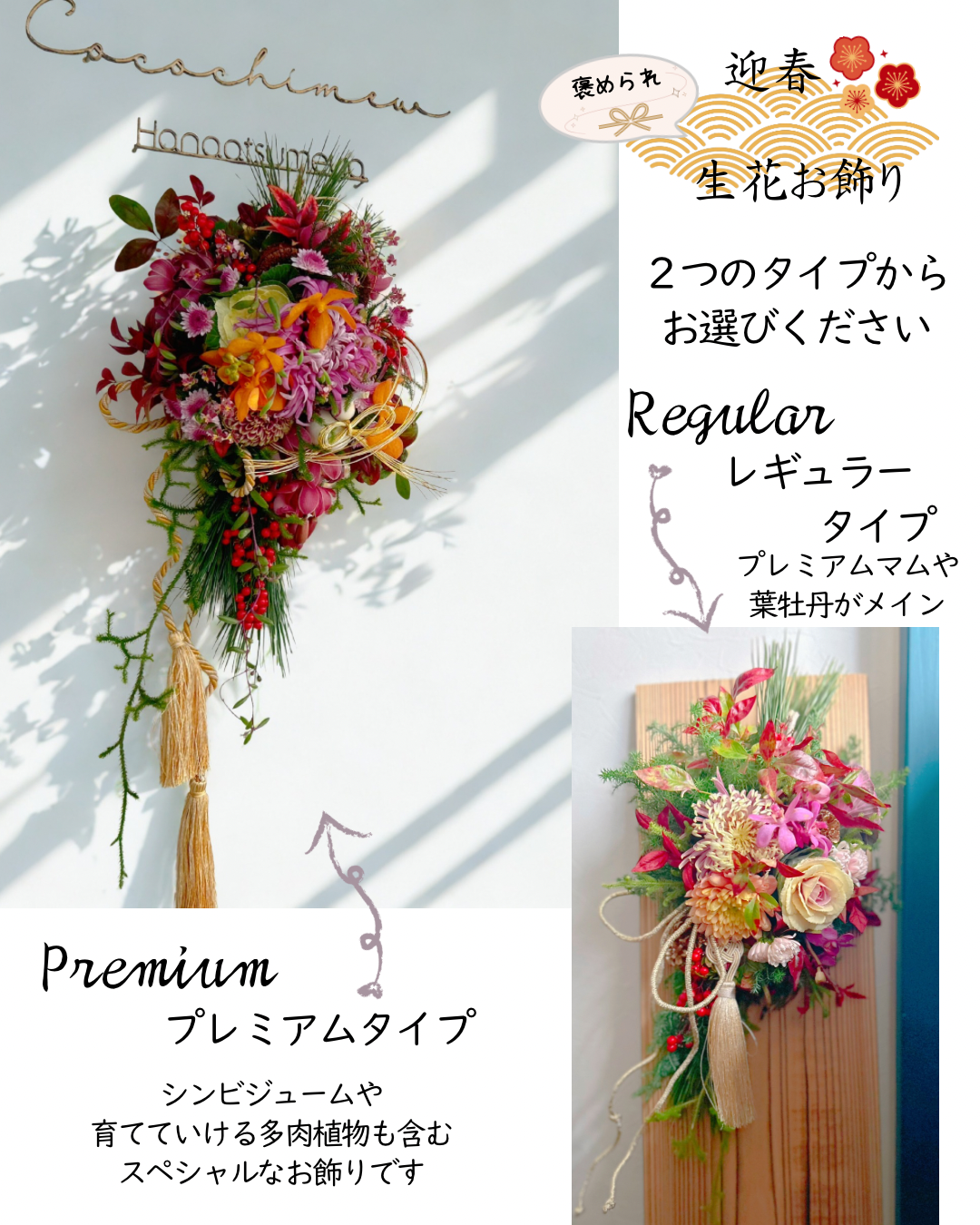 レギュラータイプに加えて、シンビジューム他、高級花材、取り外して育てていける多肉植物も入り、装飾も豪華なスペシャルなお飾りです